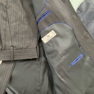 Gray wool, pinstripe design. Comes with garment bag and hanger.
