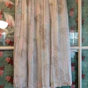 Vintage CHAUS pleated skirt, midi length taupe paisley with pastel yellow blue and pink flowers. Skirt is lined, top pleated panel is very sheer. Button closure and elastic back to waistband. Missing an inner button-not noticeable from outside when worn.