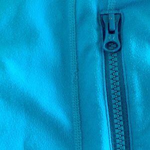 This Lululemon jacket is in good used condition, and has signs of wash wear and light pilling. The final photo shows a place where the stitching is a bit off. Blue color with a hint of green. Despite a few minor flaws it still looks good, with many good wears ahead! Smoke free, pet friendly home.