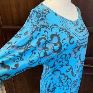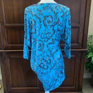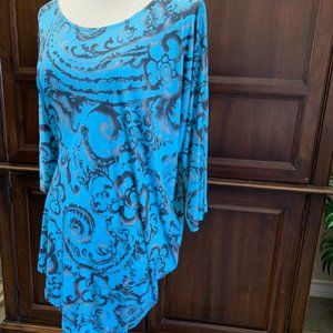 23" pit to pit (armpits are large and loose because of the asymmetrical shape)