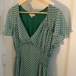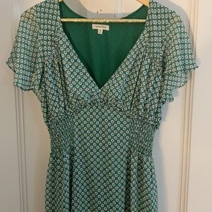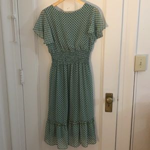 Super fun and new condition Max Studio Flutter Sleeve Green Floral Midi Dress. Flattering smocked waist. Beautiful ruffle hem. Lightweight and comfy! V neckline