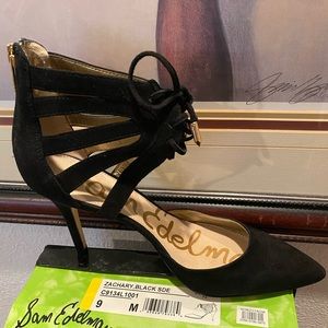 Black suede heels, gold zipper in back lace up in front 3 1/2 heels. Size 9M never worn in original box.