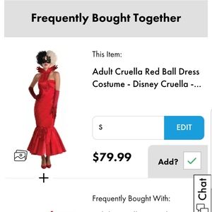 Cruella costume includes red dress, blackmask, and red gloves. Brand new never opened.