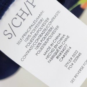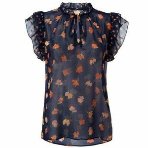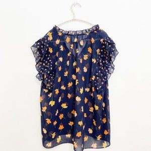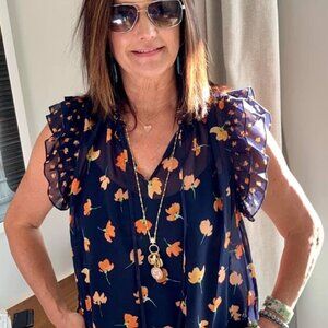 Sheer navy blue fabric with floral orange poppies print. Short ruffled flutter sleeves. Tie neck with ruffled collar. No line, excellent condition, worn once.