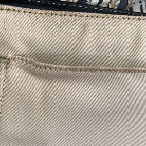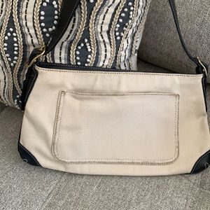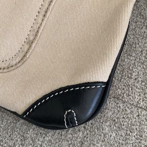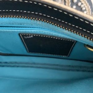 Vintage canvas Coach purse with black leather handle and trim. This purse was barely used but does have some marks on front and back of bag near the stitching. Could be cleaned but I did not want to mess with it. Inside zippered compartment and back compartment. Pretty blue interior lining in perfect shape - no stains.