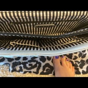 - Inside has multiple compartments- two zip compartments plus two separate smaller pockets. Has black and white striped interior. Large enough to fit all your daily essentials