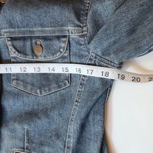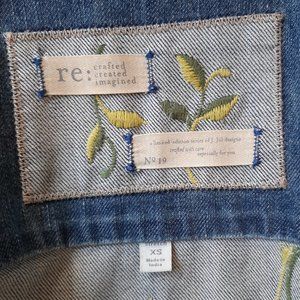 J. Jill Recrafted Floral Embroidered Medium Blue Denim Jacket. Limited edition by J. Jill "Recrafted" denim jacket with long sleeve, button front, slightly fitted silhouette and back floral embroidery. Slip front pockets. Very good preowned condition. No fabric content. Small spot on inside seam (see photo) and slight discoloration on sleeve (see photo). Measurements in photos are approximate. Size XS.