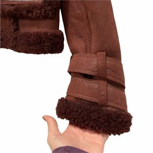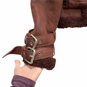 •The Asher biker jacket is crafted entirely from thick sheepskin for ultimate warmth and luxury. Textured shearling seams create structure in the oversized silhouette, while belted cuffs add a signature biker detail.