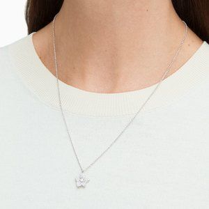 Silver tone flower studs and mini flower pendant. Cubic zirconia. Chain 17" with 3" extender. Pendant and earrings width approx 1/2".