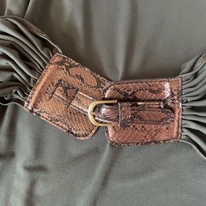 New dress with a goegeous bronze color belt. Flowy and forgiving , has some stretch to it. Size 8. A great addition to your closet! Please ask me questions!