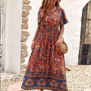 Boho floral print knot front A line dress