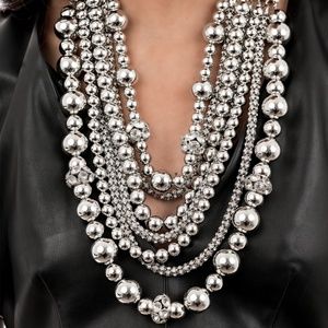 Held together by rectangular silver frames, a couture-clutching collection of oversized silver beads interspersed with white rhinestone encrusted ornaments alternates with interlocking rows of white rhinestone encrusted chains across the chest. Edgily enhanced with linked rows of silver chain fittings, the emboldened silver layers demand to be seen with their unapologetic attitude. Features an adjustable clasp closure.
