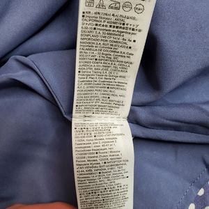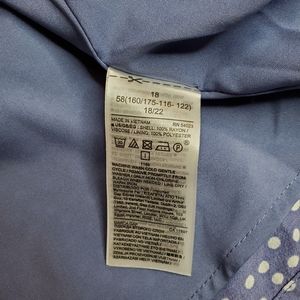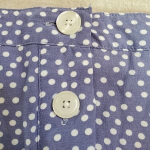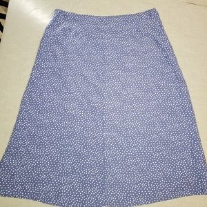 5 button front, midi skirt, white dot on blue background. Excellent, like-new condition, never worn. This is a nice, flowyskirt for those who live in warmth year-round, or those looking to store a little something pretty and delicate for next spring and summer. Very soft, fully lined.