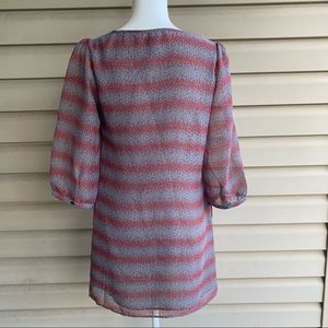 This is a sweet, lined shift dress from Emmelee, size Medium. The sheer fabric, 100% polyester, is gray, with a repeating pattern of tiny red poppies. Features three quarter length sleeves that are unlined, pullover styling, a rounded neckline, hidden pockets, and gentle gathers for a relaxed fit. Wear with either flats or heels - it’s a winner!