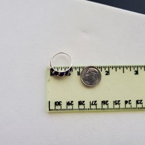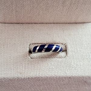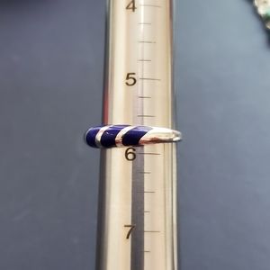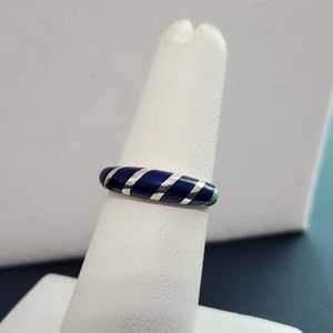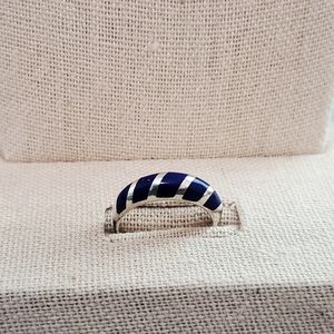 This pretty sterling lapis band ring is a wonderful blend of Southwestern simple style and a more modern, sleek esthetic. It measures as approximately size 5.75, but I normally wear a 6.75 to 7, and it fits on my ring finger (pictured). Not marked, but definitely professionally tested as 925 silver. What a great ring! See all pics!