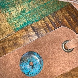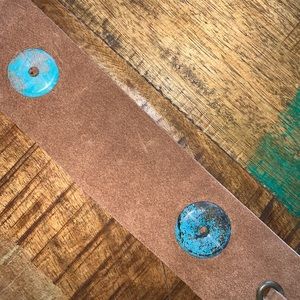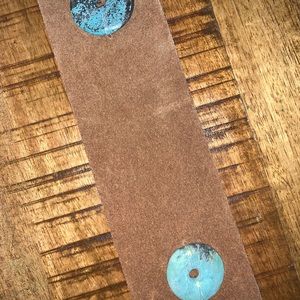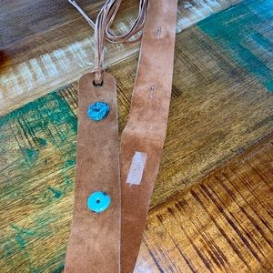 Vintage Suede and turquoise tie belt. Measures 67” from end to end. Grommets on ends with suede tassels for tying.