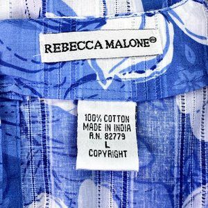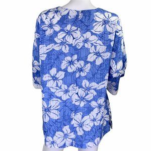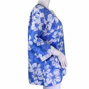 Rebecca Malone Blue Floral Embroidered Split Neck 3/4 Bell Sleeve Top EUC Size L