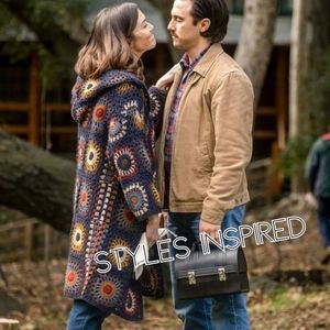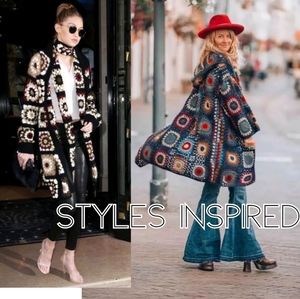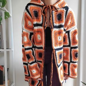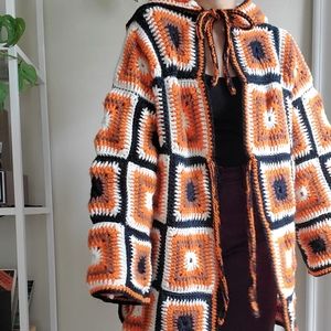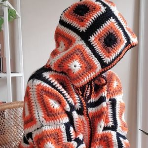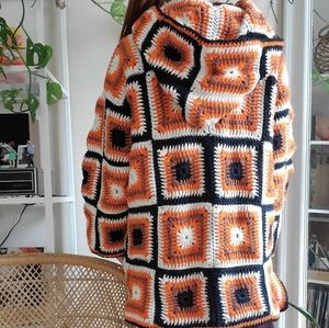 RARE Handmade Granny square afghan crochet hooded sweater jacket. In orange, brown , black and white colors. In great condition. Estimated size L-XL .