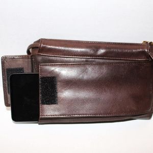 My phone (approx 6 x 3 in OtterBox case) fits into the top zipper compartment as well as the gussetted ( Velcro)compartment on the backside.