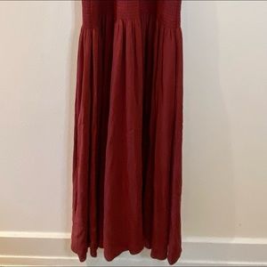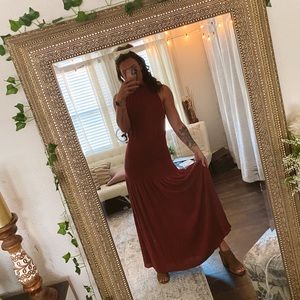 Burnt red dress - beautiful flowy bottom with flattering curve hugging mid section. Halter top. Is missing one fastening button, however does not affect the wear of the dress.