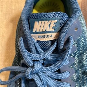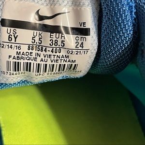 Pre-Owned Nike Running Shoes in a size 6 youth. This would be about a size 7.5-8 in women’s but I think it’s fits more like a 7.5. Shoes are blue with white, black, and green. These show some signs of wear but still in good used condition.