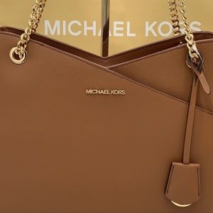 MK large XChain Shoulder tote DETAILS • Shoulder bag • Saffiano leather • Color-Luggage • Gold-tone hardware • 15.6”W X 11”H X 5.5”D • Handle drop: 10" • Exterior details: front slip pocket