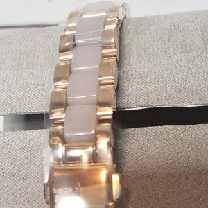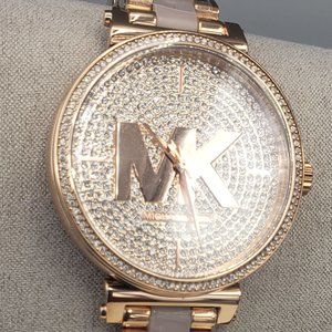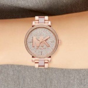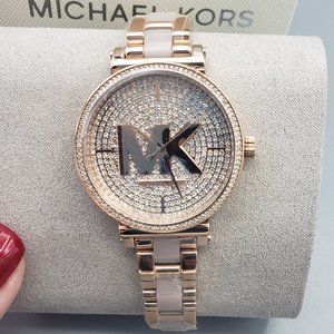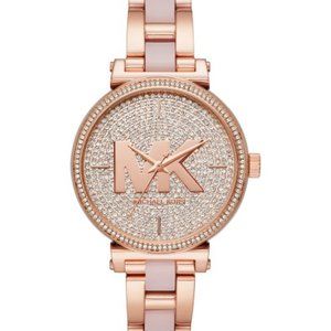 Michael Kors Sofie Watch. Round Face with Crystal Accents, 36mm. Strap: Rose Gold-Tone Stainless Steel Sand Blush Acetate with Foldover Clasp Closure; approx. adjustable length: 175mm. Dial: rose gold-tone sunray with crystal accents. Bracelet Style. NWT. Box Included