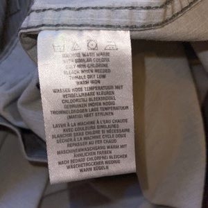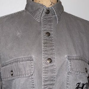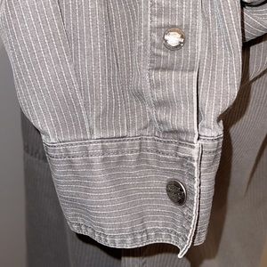 GUC. Double breasted snap front pockets. Snap sleeves. Embroidered on left chest pocket and back. One area of discoloration over right chest pocket. See pic. Gray with white pin stripe. Measurements upon request.