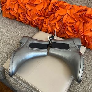 NWT EMU Australia “Ellin” Pull On Waterproof Rain Boots, Back pull on tabs, elastic on both sides, with Removable Sheepskin Insole. Size 9. I consider the color a metallic gray/silver/pewter color. Comes from a smoke and pet free home.