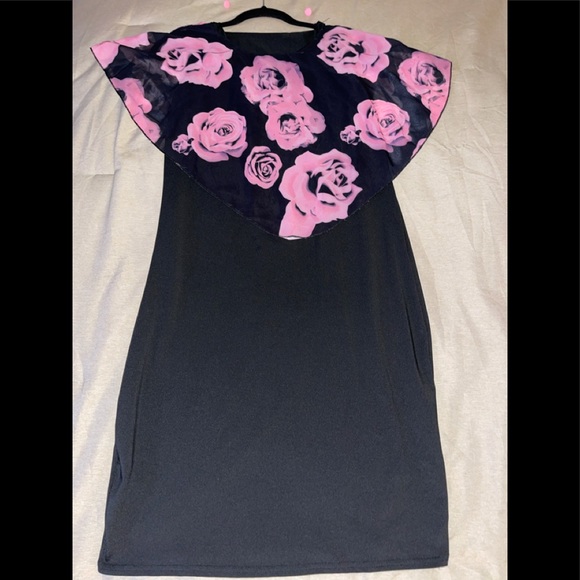 Chiffon pink floral over-lay - over solid black dress ..tag with label is out but I know it’s JWB - size and material tag is in dress ..