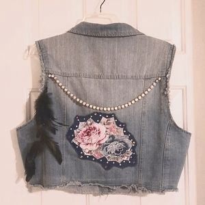 One of a kind vest hand sewn patch on back, roses and sparkles , a chain , optional feather detail, can remove if requested! one of a kind original art