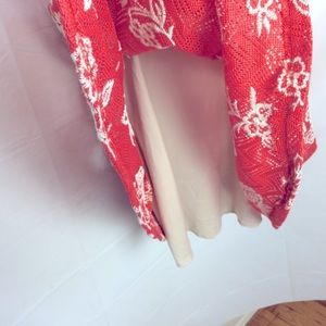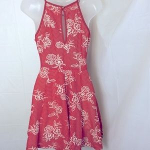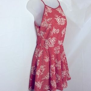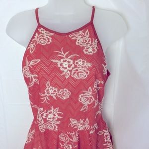 Sleeveless cami high neck orange red mesh crochet mini dress with prairie floral overlay pattern. Color is closest to salmon with white flowers. Peekaboo back. Fully lined. Perfect for summer - birthday parties, showers, picnics, Central Park, dates, anything!