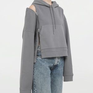 Hoodie in cotton with side zipper attaching a removable panel. It can be worn as a sweatshirt, as an asymmetric gilet or with the zip half open to create a distorted look. It offers a relaxed-fit with drawstring neck and 3D seams.