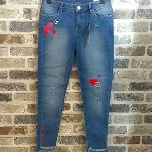 Brand new and in perfect condition. Adorable CK jeans with red, pink, purple hearts and CK logo on bottom leg. Light factory distressing to knee and pocket. Make me an offer 😉