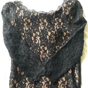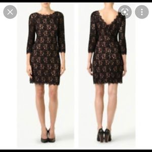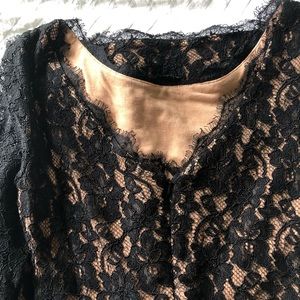 T. Babaton for Aritzia lace v-back Rafael dress size 0. The dress is black with a nude/beige underlay. Overall in excellent condition worn only a couple of times. A few tiny pulls (see pictures) not noticeable unless you are holding the dress up to your face. Also a few marks inside, not noticeable at all while wearing the dress.