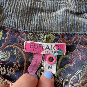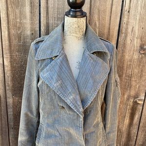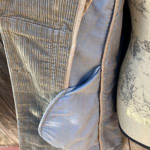 This fabric is blue underneath and green on top. Corduroy Feel. It has a pocket on a sleeve and 2 pockets on the sides. It is very flattering on. Bit of a vintage military feel.
