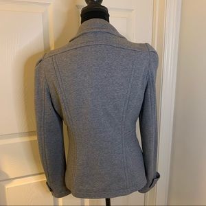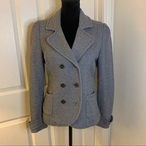 H&M Medium Gray Blazer Jacket, Shell: 65% Cotton 35% Polyester, Lining: 100% Polyester. Great coat for the fall, pairs nicely with jeans, dresses and dress pants.