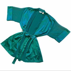 Vintage Victoria's Secret gold label emerald green short kimono belted robe. has sheer detailing around the neck, down the front edges and on the sleeves. has side pocket and a inside tie