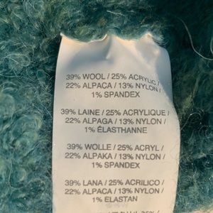 39% wool, 25% acrylic, 22% alpaca, 13% nylon, 1% spandex