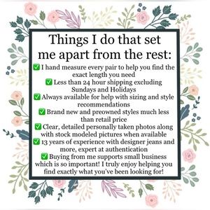 ABOUT ME: I’ve been wearing and selling designer jeans for 13 years. All of my pairs are 100% authentic. I hand measure every pair the same way tailors do so you can be certain you’ll get the size and length you need. 😊