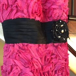 This black hot pink dress has only been worn once and is in perfect condition. The rose details on the dress are gorgeous. The black has a zipper and a lace up.