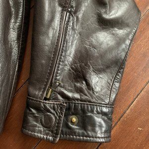 New without tags. This top quality, dark brown, all-leatherjacket will only get better with age! All-leather shell with cotton lining. Metal YKK full-zip front with snap collar. YKK zip cuffs with two position snap closure. Snap breast pockets, slash waist pockets. 3 inner pockets, one zippered, one cell phone pocket, and one regular. Elastic waist. RN 58909.