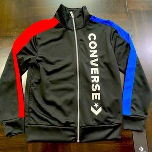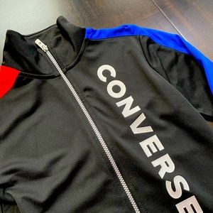 Boys black zip-up track jacket by Converse, made in lightweight and soft jersey, with red and blue trims down the sleeves. It has pockets on the sides, and a silver appliqué logo down the front. It does up with a zip fastening.
