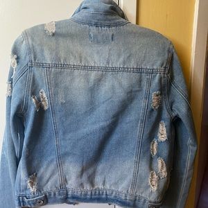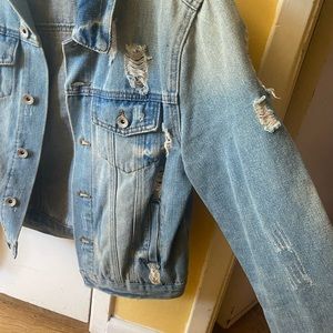 Ripped jean denim jacket, worn once, great condition. Made in China. 6 pockets in total!