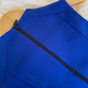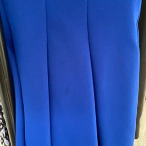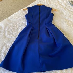 Pre-loved with mark on front pleat ( see photo). Scuba like fabric hits at knee. Fully lined with net trimmed lining. Small hook and eye closure at neck.