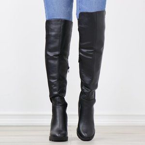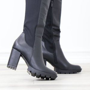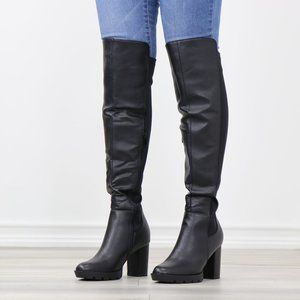 Black Faux Leather Round Toe Thigh High Over The Knee Lug Block Heel Boots
