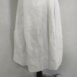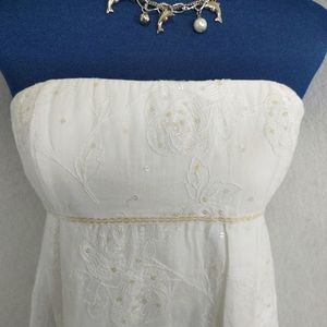 Strapless dress, with empire waist, is detailed with embroidery and sparatically placed sequins