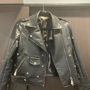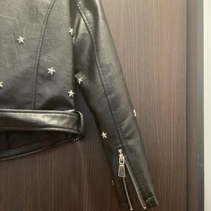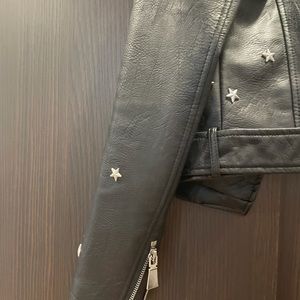 Super luxe and buttery-soft jacket in a moto silhouette featuring allover metal star studded detailing. This jacket is everything edgy and cool. Zip front closure and multiple zip pockets. Lined.