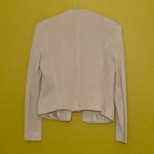 A formal baby pink jacket that sits higher than suit jackets but is longer than crop jackets. In a woven fabric Perfect for slightly cool temperatures.