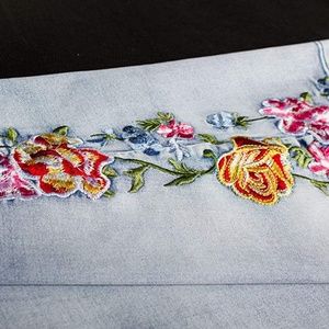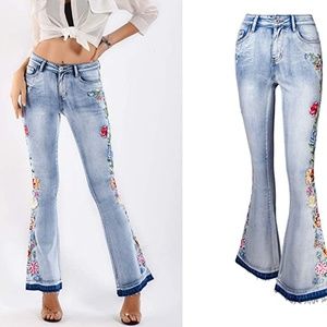 Lovely, chic and feminine these embroidered floral flared high rise jeans are an absolute closet keeper❤️Tones of yellows,blues and pink accent your legs all the way down. Accented by a deeper blue hemline. Fabric content 97% cotton, 3% spandex for a beautiful and comfortable fit and design. Slight easy give to fabric.